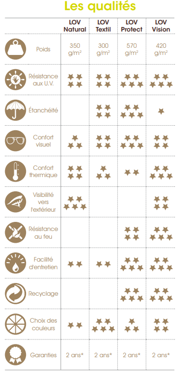 Plusieurs caractéristiques sont également à prendre en compte selon vos besoins : protection UV, étanchéité, confort visuel et thermique.